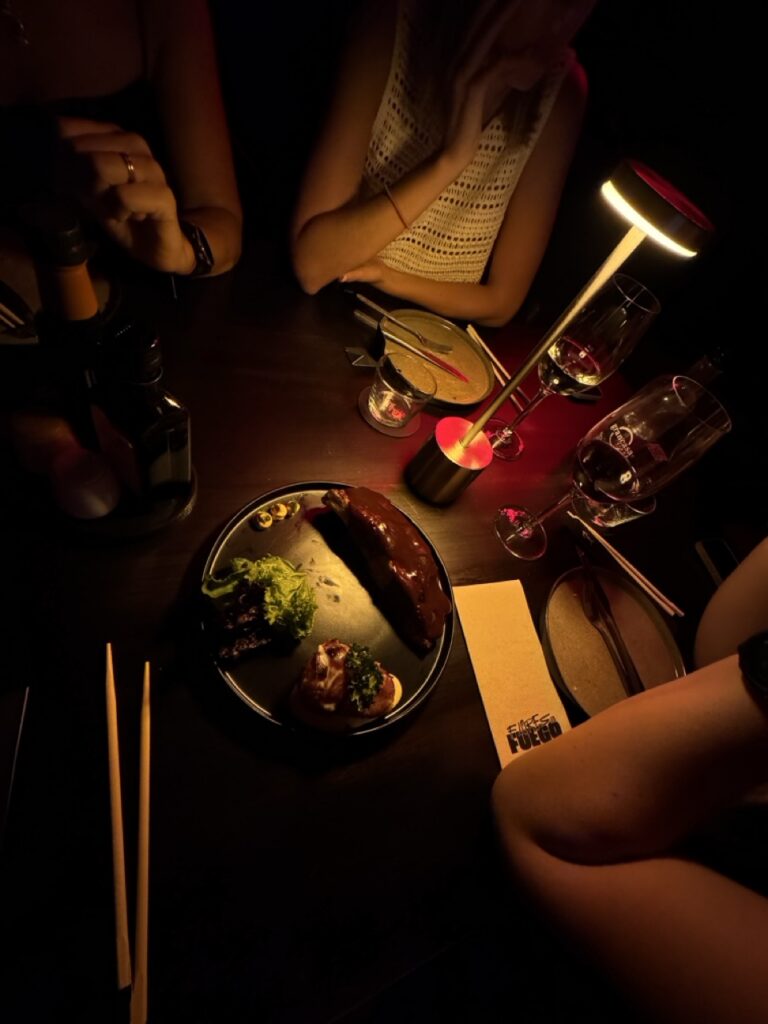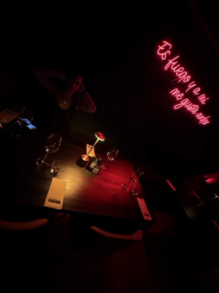 Una de las cosas que más divierten de Flores en Fuego es que el lugar tiene dos energías distintas. Por un lado, un espacio más relajado, ideal para sentarse a comer tranquilo y disfrutar la conversación. Y por otro, una atmósfera más vibrante de bar, con DJ, música y cocktails que invitan a quedarse y dejar que la noche siga.